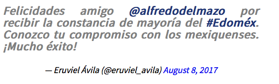 El gobernador mexiquense Eruviel Ávila, de extracción priista, envió una felicitación al gobernador electo para que reciba la constancia de mayoría