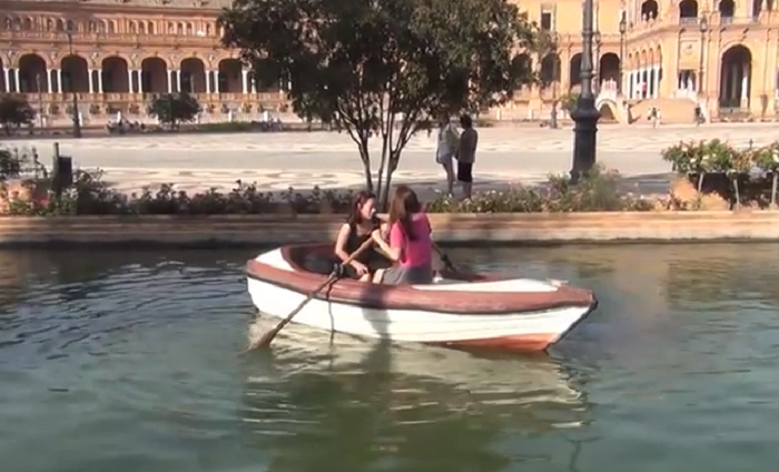 El youtuber Docm77 subió a su canal un video grabado en la Plaza de España, en Sevilla, donde dos jóvenes pasan una verdadera vergüenza por no saber remar un bote que acabañan de alquilar.