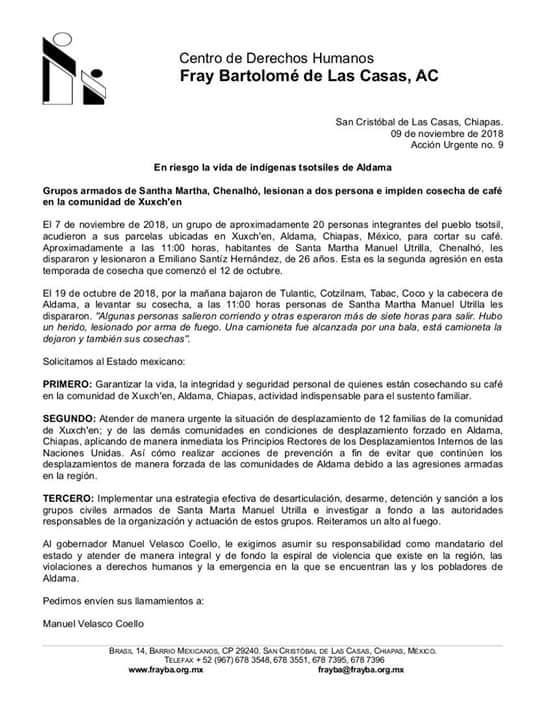 Azalia Hernández, coordinadora de Comunicación del Centro de Derechos Humanos Fray Bartolomé de las Casas -organización que está apoyando a las personas desplazadas- confirmó que en el municipio de Aldama los disparos continúan y la violencia se intensifica porque empezó la temporada de cosecha de café, y los agresores están impidiendo a los campesinos cosecharlo, lo que está limitando cada día sus recursos económicos. Por ello, el Centro publicó un llamado urgente al gobierno estatal de Manuel Velasco para que proteja la vida, integridad y seguridad de los campesinos.