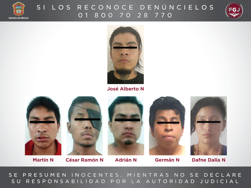 Los presuntos extorsionadores fueron identificados como Jorge Alberto “N”, de 27 años, señalado como el presunto líder de esta banda delictiva; Martín “N”, de 25 años; César Ramón “N”, de 31 años; Adrián “N”, de 25 años; Germán “N”, de 31 años, y Dafne Dalia “N”, de 24 años.
