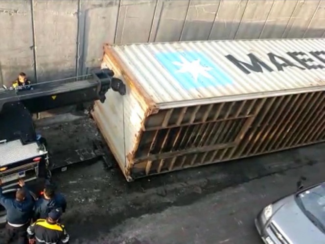 El incidente vial ocurrió en el paso a desnivel de la Avenida 503, que conecta con los carriles laterales del Circuito Interior, con dirección al Aeropuerto Internacional de la Ciudad de México (AICM), en la que el contenedor obstruyó el carril derecho para avanzar en dicho tramo.