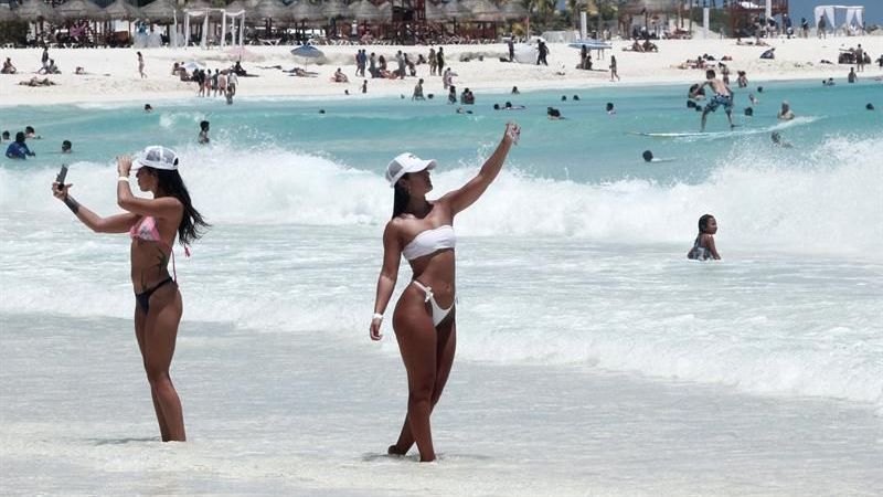 Vista de decenas de turistas mientras disfrutan de la playa este sábado, en Cancún, en el estado de Quintana Roo (México).