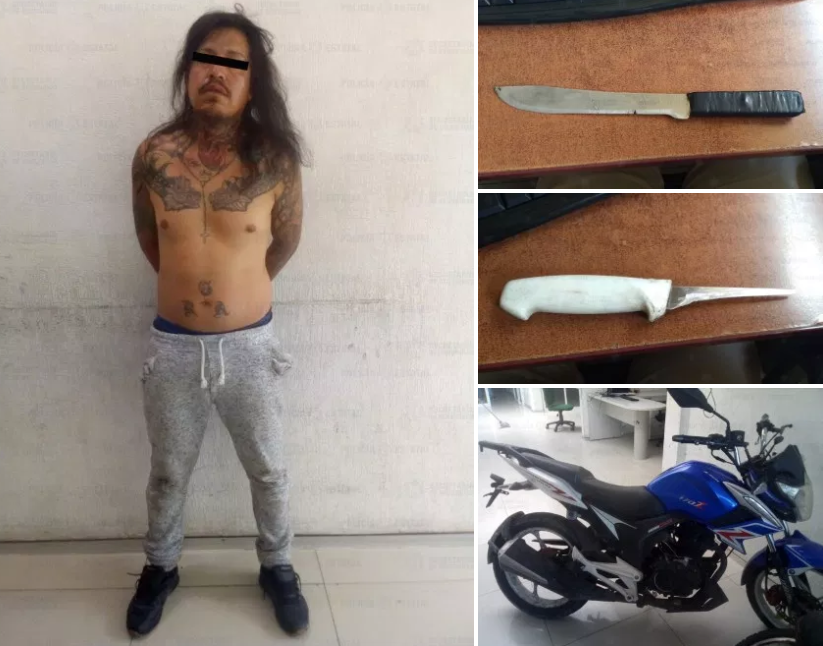 Después de su captura, Rigoberto “N” de 35 años de edad y sus dos acompañantes, un par de menores de 17 y 14 años de edad fueron sometidos a una revisión protocolaria que derivó en el hallazgo de tres armas blancas, así como la mercancía que hurtaron momentos antes.