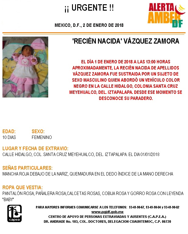 La Procuraduría General de Justicia capitalina activó la Alerta Amber para localizar a una menor de 10 días de nacida, de apellidos Vázquez Zamora, de quien se desconoce su paradero desde las 13:00 horas del pasado 1 de enero, cuando fue sustraída por un hombre de un domicilio, ubicado en calle Hidalgo, colonia Santa Cruz Meyehualco, delegación Iztapalapa.