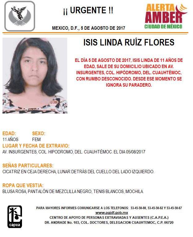 En un comunicado, precisó que el Centro de Apoyo a Personas Extraviadas y Ausentes (CAPEA) emitió el boletín de búsqueda, con la leyenda de urgente, donde se informa la desaparición de la menor.