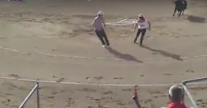 Un hombre y una mujer pueden ser vistos manifestándose en el centro del ruedo en un video que recorre las redes sociales. La protesta fue interrumpida por el propio animal que se dirigió hacia ellos a gran velocidad con la intención de embestirlos.