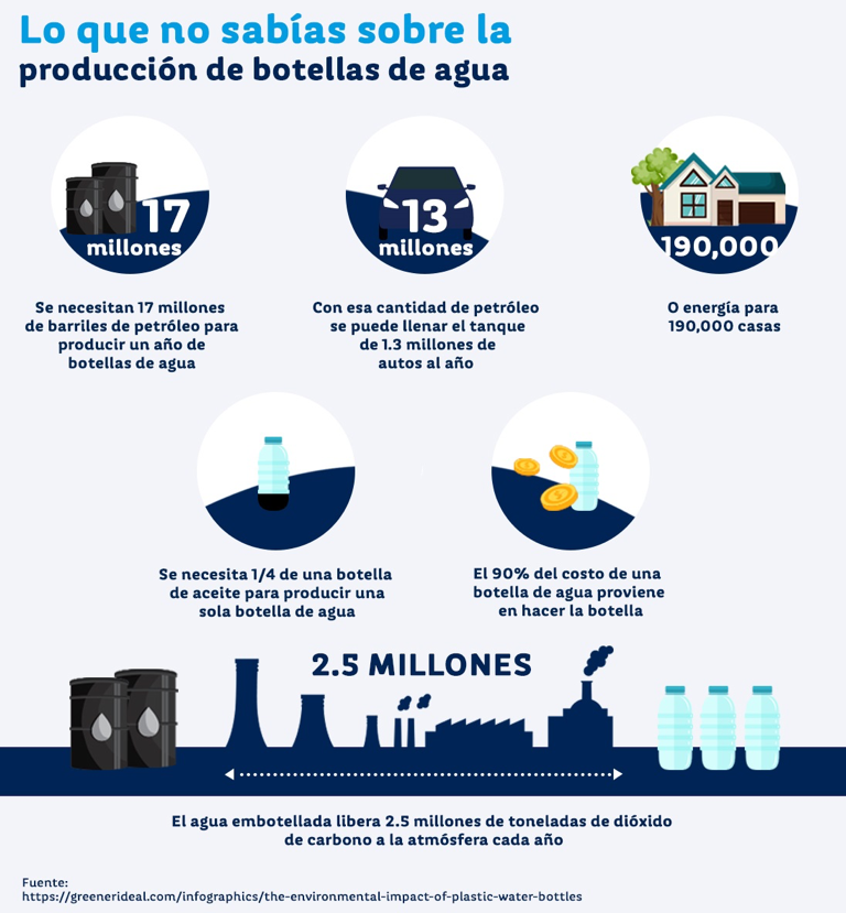 La alta demanda de botellas de agua significa que usamos más de 17 millones de barriles de petróleo para su producción. Consumir menor cantidad de botellas y emplear purificadores de agua para casa o un filtro de agua son buenas alternativas para reducir ese impacto.