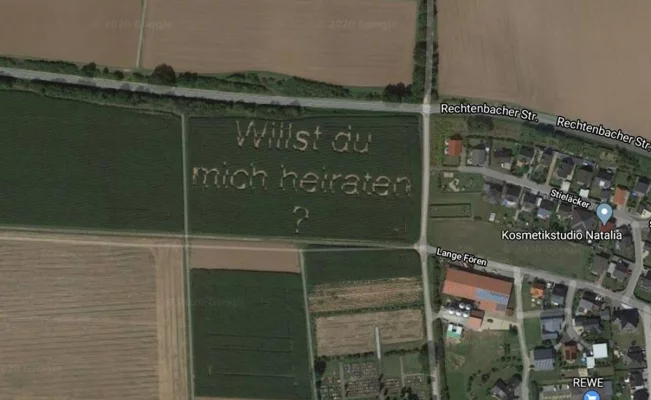 Steffen Schwartz de 32 años tuvo la idea de sembrar maíz de manera que los huecos formaran la frase “¿Te quieres casar conmigo?”, para mostrárselo a su novia, convenciéndola de volar un dron sobre el campo en Hutternberg en mayo del año pasado y así pudiera leer el mensaje.
