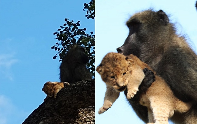 Kurt Schultz relató que este 1 de febrero estaba haciendo fotos en el parque cuando observó a un babuino que llevaba un cachorro de león en brazos.