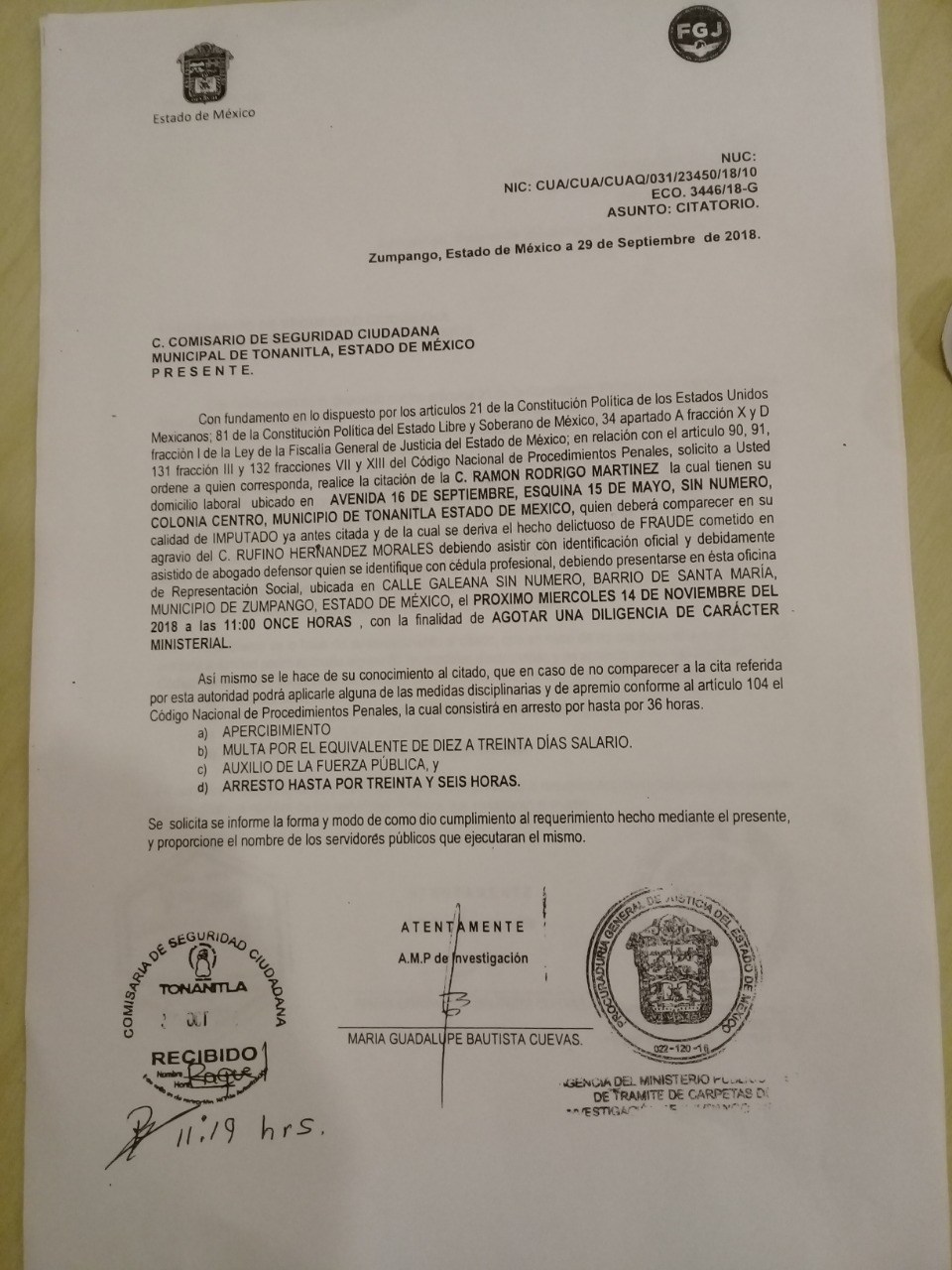 Reveló Roque Camacho, que mediante una denuncia de hechos presentada ante la fiscalía Regional de Tecámac y el Ministerio Público de Zumpango, bajo la NIC: CUAU/CUAU/00/MPI/395/07646/18/10 y la NUC: CUAU/CUAU/CUAU/031/230450/18/10, Ramón Rodrigo Martínez y su prestanombres Blanca Rosa Lara Mejía, han sido citados a comparecer este 14 de noviembre para que respondan por el delito del cual son acusados.