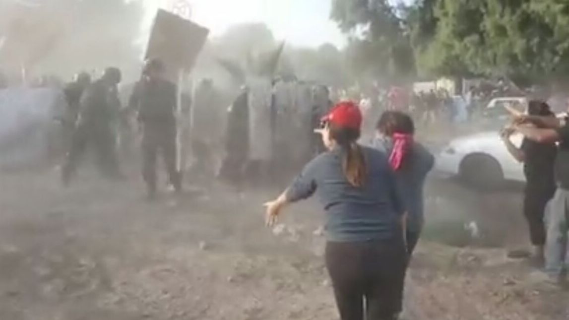 Mexicali, Baja California, Mexico.- Decenas de manifestantes que intentaron impedir la instalación de un acueducto para la cervecería Constellation Brandas que se construye en Mexicali agredieron con piedras, palos y agua y tierra, a decenas de policías estatales y municipales.