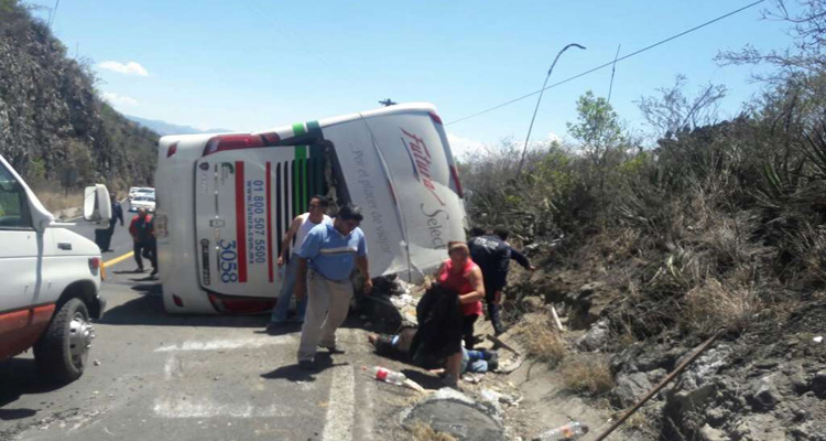 Varias personas resultaron lesionadas luego de que un camión de pasajeros de la línea Futura volcara en Meztitlán.