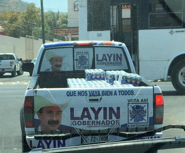 Mientras otros partidos regalan gorras, memorias usb, útiles escolares, mochilas y playeras, fiel a su estilo, Layín ha decidido regalar six de cerveza.