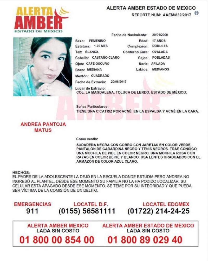 La Fiscalía General del Estado de México emitió una Alerta Amber para localizar a Andrea Pantoja Matus de 17 años, quien se encuentra desaparecida desde el 20 de junio.