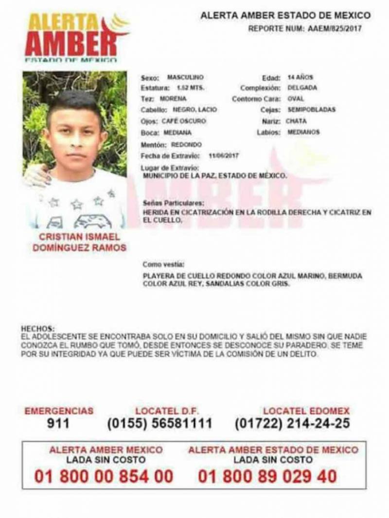 Familiares y amigos buscan a Cristian Ismael Domínguez Ramos de 14 años de edad quien desapareció el pasado domingo 11 de junio del Municipio de la Paz en el Estado de México.
