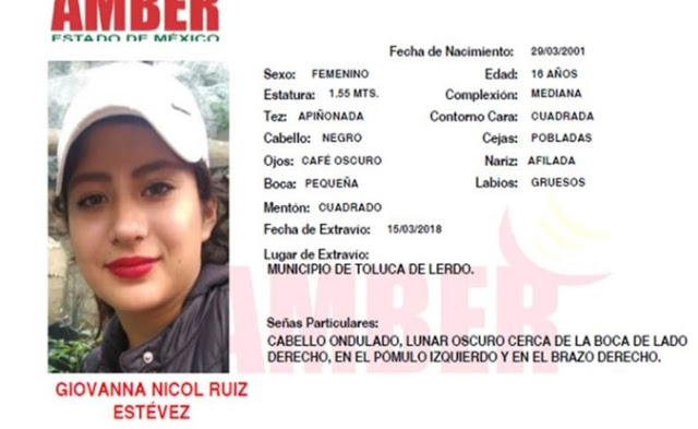 Autoridades del Estado de México activaron la Alerta Amber para ayudar a la localización de Giovanna Nicol Ruiz Estevéz, de 16 años de edad, quien fue reportada como extraviada en el municipio de Toluca el pasado jueves 15 de febrero.