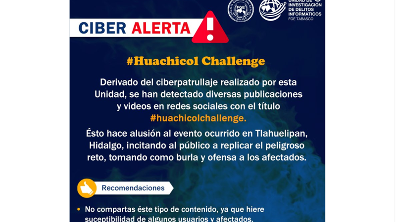 #UIDI #FGETabasco #Cibernetica #Tabasco #Villahermosa #PolicíaCibernéticaTabasco #SegurosAlNavegar #PrevencionDelitosCibernéticos #HuachicolChallenge Evita compartir contenidos ofensivos en referencia a los hechos sucedidos en Hidalgo. pic.twitter.com/ZNGbei9fCl