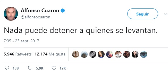 Desde las primeras horas de este sábado una cuenta verificada del autor aparece en los buscadores de la red social de microblogging. Además de retuitear la campaña de Diego Luna y Gael García para los donativos desde el extranjero, Cuarón ha compartido ubicaciones de centro de acopio organizados por la producción de su película Roma.
