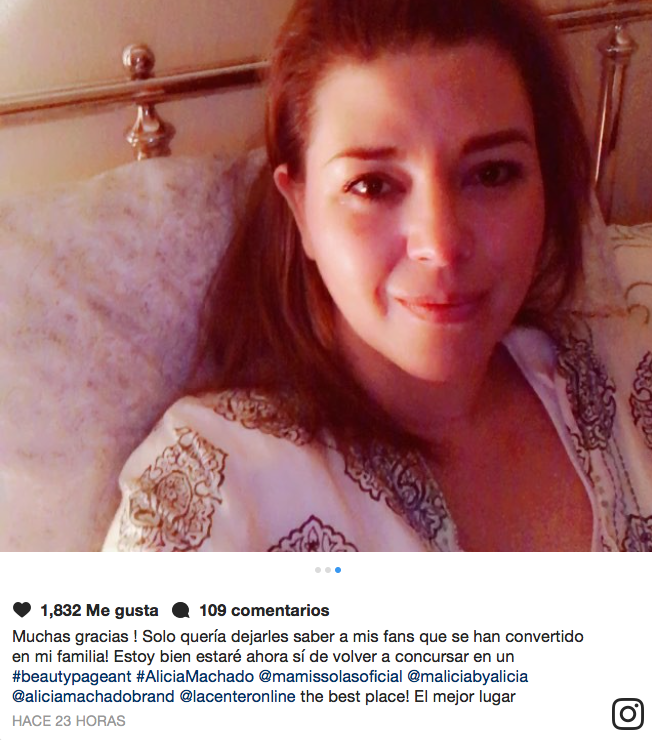 “Muchas gracias. Solo quería dejarles saber a mis fans que se han convertido en mi familia: estoy bien, estaré ahora sí de volver a concursar en un concurso de belleza”.