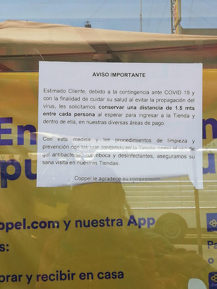 Sobre la avenida Dolores Hidalgo, la señalada tienda Coppel redujo sus horarios con motivo de la pandemia, ahora es de 10 a 18 horas de lunes a domingo, antes era de 9 a 20 horas. En la entrada se observa un letrero con un aviso a los clientes: “Les solicitamos conservar una distancia de 1.5 metros entre casa persona al esperar ingresar a la tienda y dentro de ella”.