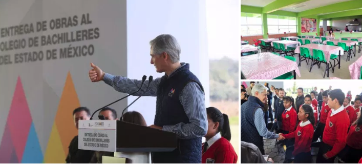 “Hoy hacemos entrega de este auditorio de usos múltiples, de la cafetería en el Colegio de Bachilleres de Jocotitlán, de la segunda etapa del plantel Colegio de Bachilleres de Tlalmanalco, que mencionaba hace un momento el Secretario de Educación, y también de distintos planteles que hemos apoyado con techumbres como las que están el día de hoy en este plantel, en Amatepec, en Tenancingo, en Zumpahuacán y en Donato Guerra”, expresó.