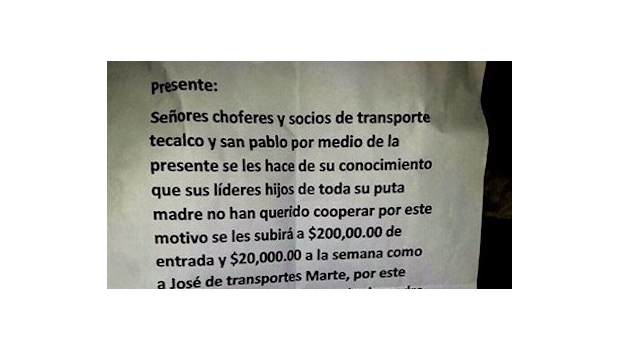 Fue por medio de un volante impreso que apareció en calles por las que circulan vagonetas de las rutas Tecalco y San Pablo, en Ciudad Cuauhtémoc, que el grupo delictivo lanzó una nueva advertencia tanto a los choferes, como a los líderes de las líneas concesionarias.