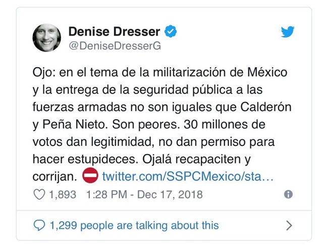 Denise Dresser acusó que el gobierno federal pretende la militarización de México y entregar la seguridad pública a las fuerzas armadas.