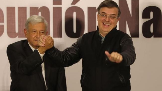 Después de presentarlo, Ebrard se acercó a dar un abrazo a López Obrador y ambos alzaron la mano en tono de triunfo.