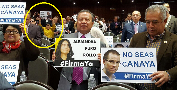 Al momento de que la legisladora priista María Angélica Mondragón presentaba una iniciativa de reforma al Código Fiscal, los integrantes de su bancada se colocaron en la tribuna y desplegaron mensajes contra el Frente Ciudadano por México y el dirigente de Morena, Andrés Manuel López Obrador.
