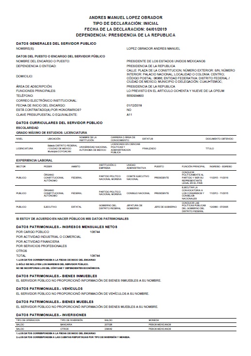 Al hacer pública hoy su declaración de bienes, el presidente Andrés Manuel López Obrador, indicó que sólo tiene dos cuentas bancarias por un monto total de 446 mil 68 pesos y no posee ningún bien mueble, inmueble, o vehículo alguno a su nombre.