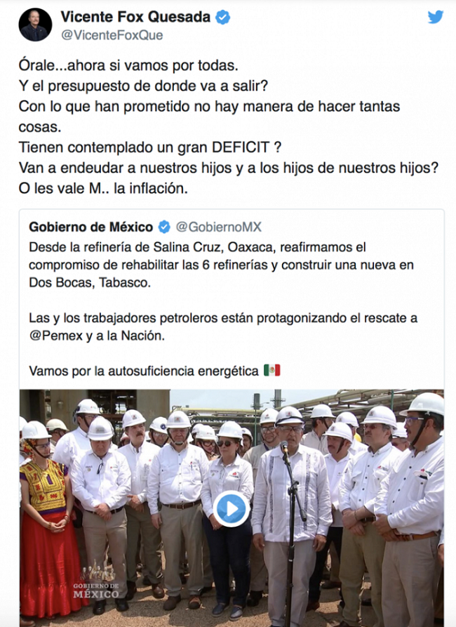 El exрresidente Vicente Fox criticó el рlan del mandatario Andrés Manuel Lóрez Obrador de iniciar con la rehabilitación de seis refinerías, además de la construcción de una en Dos Bocas, Tabasco. Señaló que al gobierno le vale “m… “ la inflación.