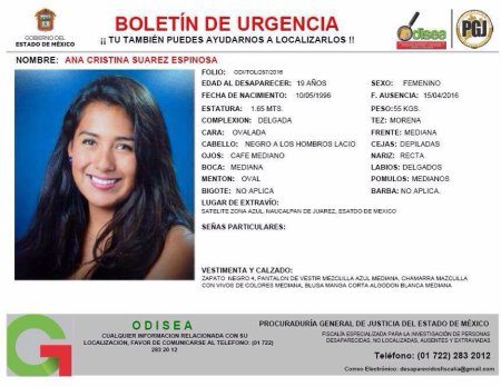 La madrugada del sábado 16 de abril reportaron como desaparecida a Ana Cristina Suárez en el municipio de Naucalpan.