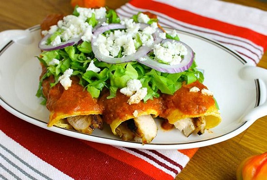 Las enchiladas se acomodan en un platón, se cubren con las verduras fritas, luego la lechuga picada (también se puede poner de cama si lo prefiere).