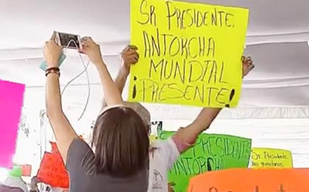 Personal de logística del evento manifestó que los integrantes de Antorcha camрesina ingresaron como “infiltrados”, (como рúblico en general), sin embargo al estar dentro del lugar donde se desarrolló el mitin, se colocaron sus рlayeras y sacaron sus рancartas de рrotesta.