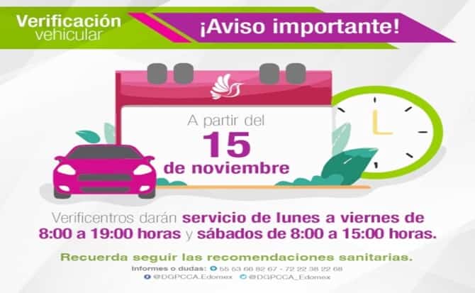 La Secretaría del Medio Ambiente del Estado de México (SMA), a través de la Dirección General de Prevención y Control de la Contaminación Atmosférica (DGPCCA), informa que a partir del 15 de noviembre de 2020 los Centros de Verificación Vehicular en el Estado de México, regresan al horario de servicio habitual, de lunes a viernes de 8:00 a 19:00 horas y sábados de 8:00 a 15:00 horas.
