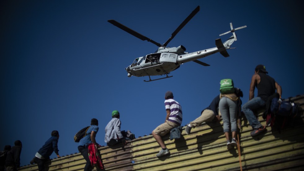A group of Central American migrants climb the border fence between Mexico and the United States, near El Chaparral border crossing, in Tijuana, Baja California State, Mexico, on November 25, 2018. – Hundreds of migrants attempted to storm a border fence separating Mexico from the US on Sunday amid mounting fears they will be kept in Mexico while their applications for a asylum are processed. An AFP photographer said the migrants broke away from a peaceful march at a border bridge and tried to climb over a metal border barrier in the attempt to enter the United States. (Photo by Pedro PARDO / AFP)