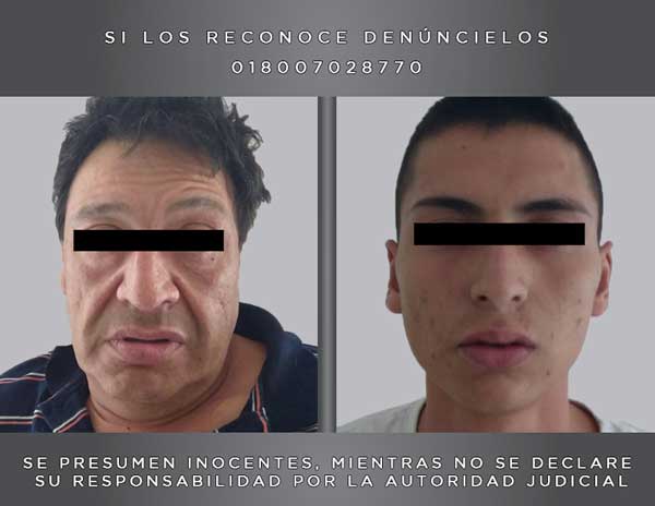 Los presuntos delincuentes fueron identificados como Néstor “N”, de 19 años de edad, y Roberto “N”, de 49 años; ambos fueron detenidos en la Avenida Santa María Guadalupe, en la colonia Santa María Chiconautla, en el municipio de Ecatepec, como parte de una investigación que realiza la Fiscalía mexiquense, tras haber recibido una denuncia por este delito.