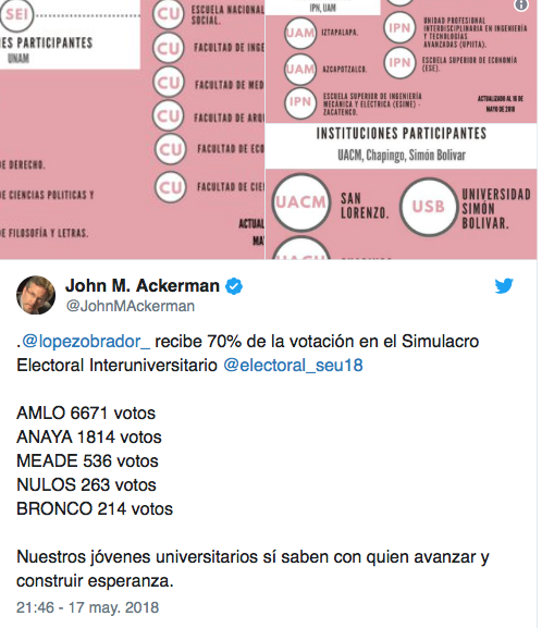 Luego de que este jueves se llevara a cabo el ejercicio en 21 instituciones de educación superior, representantes estudiantiles de la Universidad Nacional Autónoma de México, del Instituto Politécnico Nacional, de la Universidad Autónoma de la Ciudad de México y de la Universidad Autónoma Metropolitana informaron que el tabasqueño obtuvo el 70 por ciento de los votos.