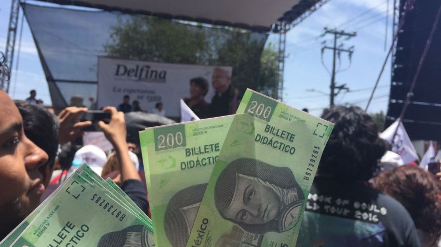 Un grupo de provocadores se infiltró en el mitin de Delfina Gómez Álvarez, aspirante de Morena al gobierno del Estado de México, para arrojar billetes de 200 pesos de fantasía.