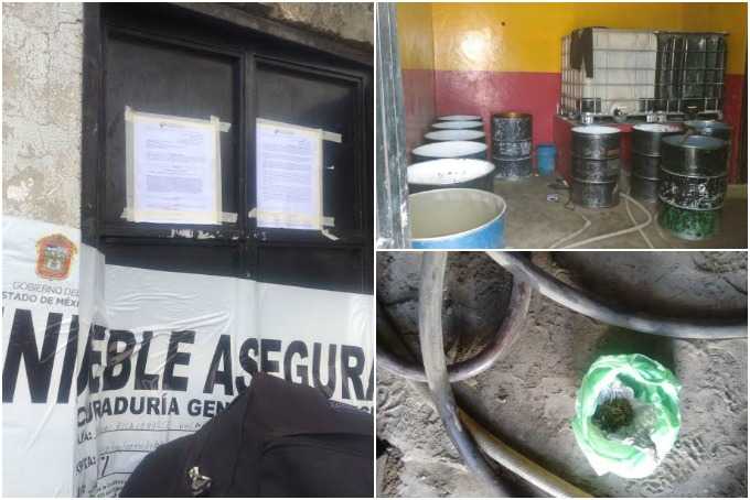 Fuerzas federales y del Estado de México recuperaron más de cuatro mil litros de combustible y grandes cantidades de droga en el municipio de Jilotepec.