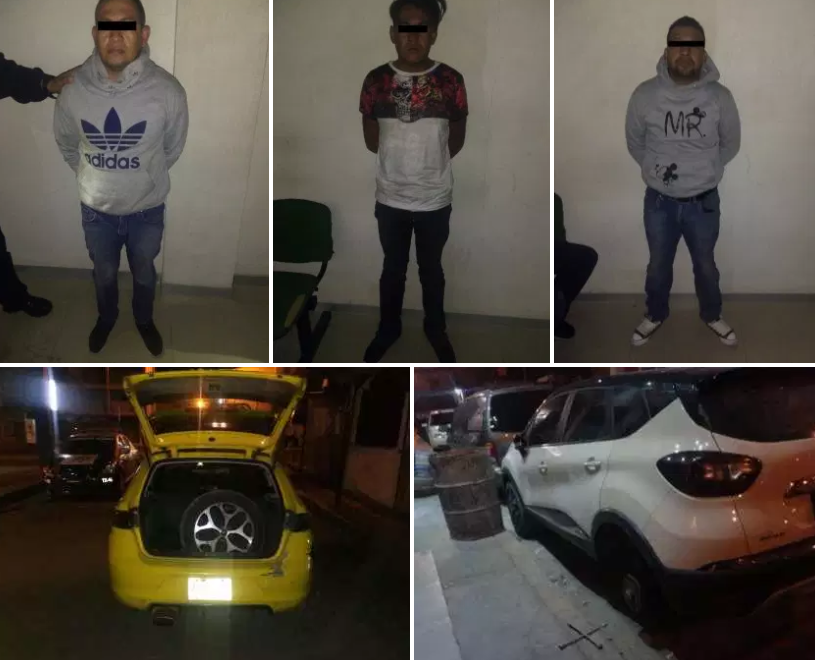 Ante las evidencia se notificó a los tres sujetos identificados como Ricardo “N”, Cayetano “N” y Alejandro “N”, que estaban cometiendo el delito de robo, dándoles a conocer sus derechos, para ser puestos a disposición de la Fiscalia Regional de Texcoco, junto con la llanta presuntamente robada, el auto Seat Ibiza, la llave de cruz el gato hidráulico quedando registrados con el número de folio 1326912 y referencia MEX/033888/2019, en espera de que se determine su situación legal.