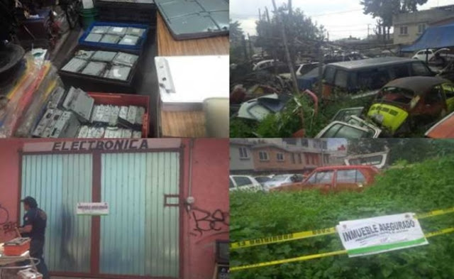 Posteriormente, los oficiales de Investigación se trasladaron a San Pedro Totoltepec donde localizaron en un inmueble a cielo abierto 18 vehículos desmantelados de varios modelos y marcas, sin números de identificación y con escurrimiento de aceite y corrosión.