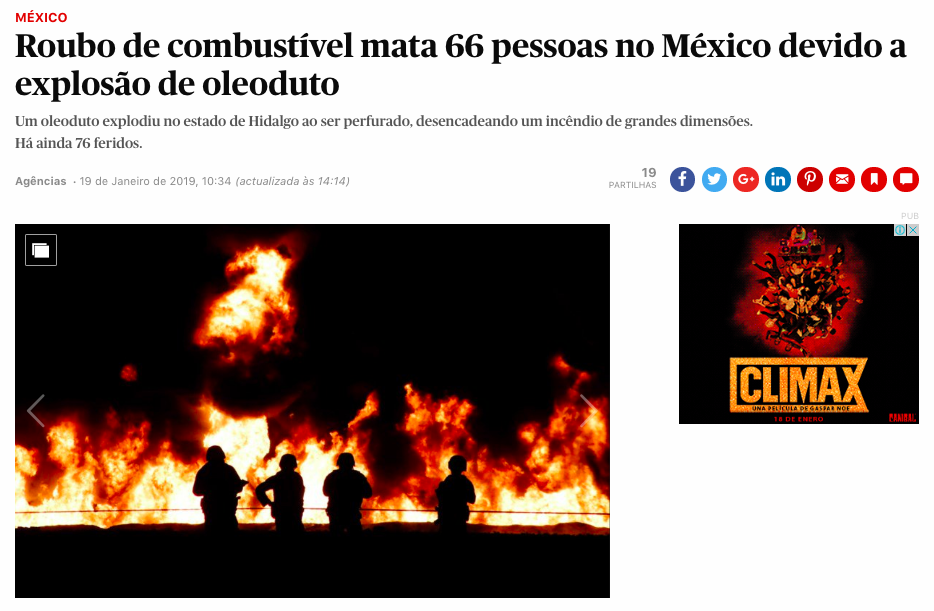 El digital portugués también da cuenta de las víctimas y fallecidas a consecuencia del accidente en el estado de Hidalgo.