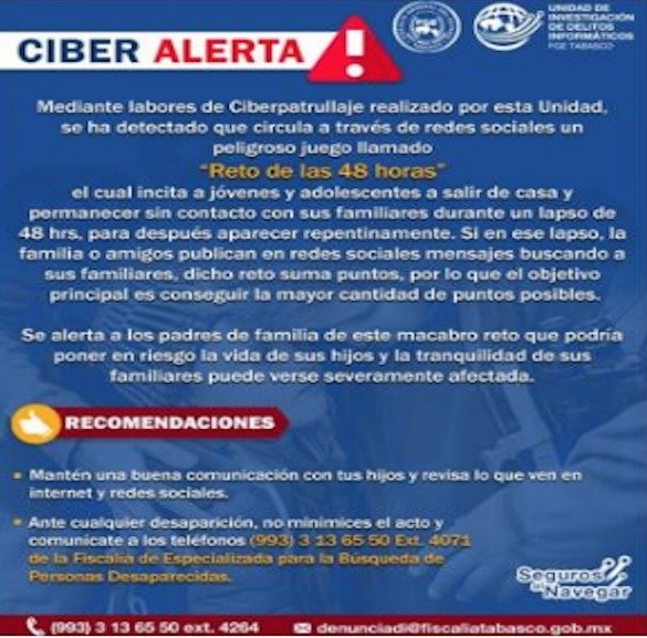 Las autoridades de la Fiscal del estado explicaron que este nuevo juego, llamado “Reto de las 48 horas”, se extendió desde España hasta nuestro país a través de las redes sociales, el cual consiste desaparecer voluntariamente, el “concursante” habrá de ausentarse de su hogar sin algún tipo de contacto con familiares o amigos, y regresar sin previo aviso.