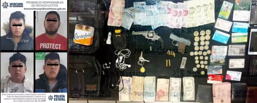 Los implicados responden a los nombres de Alexander “N”, de 22 años; Rodrigo “N”, de 23 años; Noé “N”, de 20 años, y David Ricardo “N”, de 21 años de edad, a quienes se les realizó una inspección preventiva que derivó en el aseguramiento de dos armas de fuego: un revolver calibre .32 milímetros, marca Smith & Wesson, con un cartucho útil y otra tipo pistola escuadra, calibre .25 milímetros, marca Raven, con cuatro cartuchos útiles, además de los objetos robados.