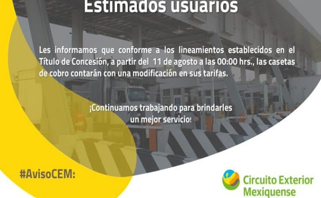 Este domingo la empresa OHL, ahora Aleatica, aplicó un segundo aumento en su tarifa de peaje en el Circuito Exterior Mexiquense, del cual es concesionaria, el cual oscila entre el 5 y el 10% en cada una de las 31 casetas que conforman la ruta de 110 kilómetros.