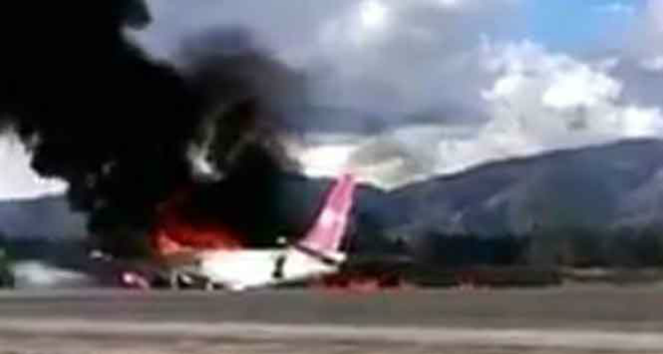 Videos difundidos en redes sociales muestran al avión a un costado de la pista, al final de un camino de fuego que dejó el ala derecha, mientras los equipos de emergencia llegaban para sofocar las llamas.