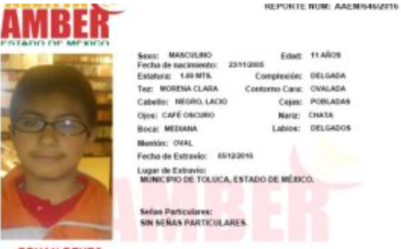 Originario del municipio de Toluca, Bryan Reyes Pérez se reporta como desaparecido desde el pasado 23 de noviembre, mismo que fue visto por última vez al asistir a la escuela, en la capital del Estado de México; desde entonces se desconoce su paradero y se teme que pueda ser víctima de la comisión de algún delito.