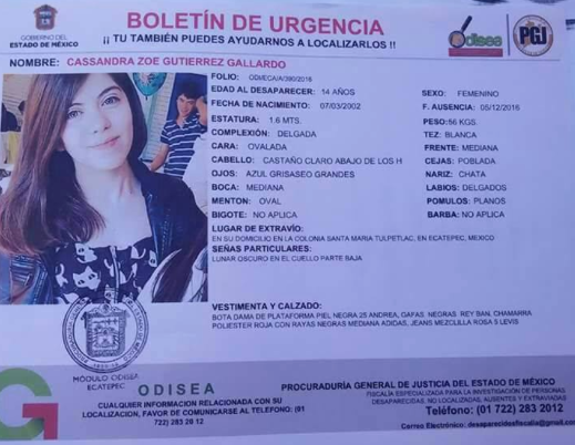La Procuraduría General de Justicia del Estado de México reporta como desaparecida a Cassandra Zoé Gutiérrez Gallardo desde el pasado 5 de diciembre, por lo que se pide apoyo para proporcionar cualquier tipo de información que pueda ayudar a encontrarla.