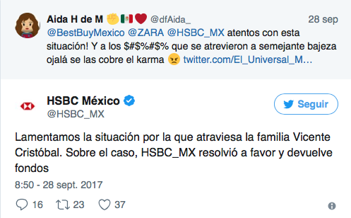 El banco HSBC informó que devolvió el dinero que durante el fin de semana fue robado de la tarjeta de Alejandra Vicente Cristóbal, quien falleció el pasado 19 de septiembre luego de que el edificio en el que vivía en las calles de Torreón y Viaducto se derrumbara.